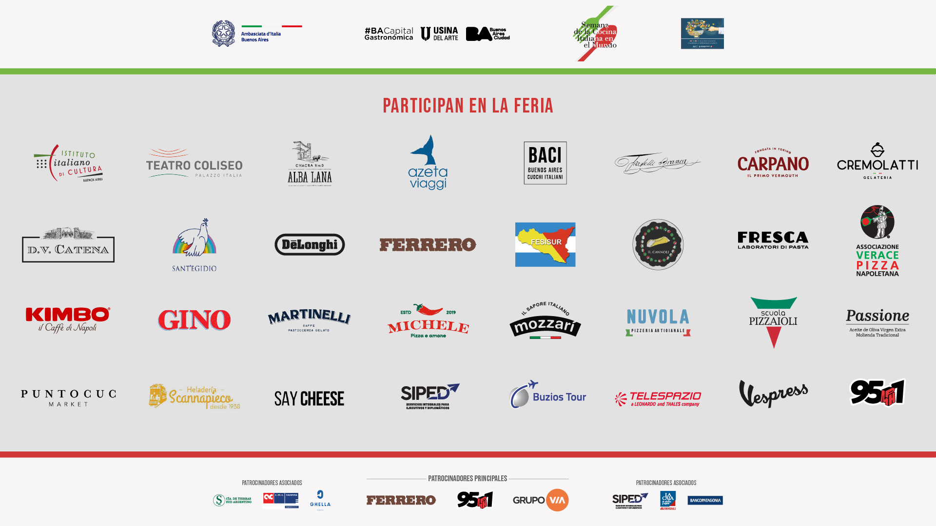 La Feria Gastronómica Italiana, organizada por la Embajada de Italia en Buenos Aires, cuenta con el apoyo del Gobierno de la Ciudad de Buenos Aires, los patrocinadores principales: Ferrero Argentina, Grupo Vía y Metro Power Hits y los patrocinadores asociados: Banco Patagonia, Compañía de Tierras Sud Argentino, CMC di Ravenna, Ghella, La Caja Grupo Generali y Siped Buzios Tour.