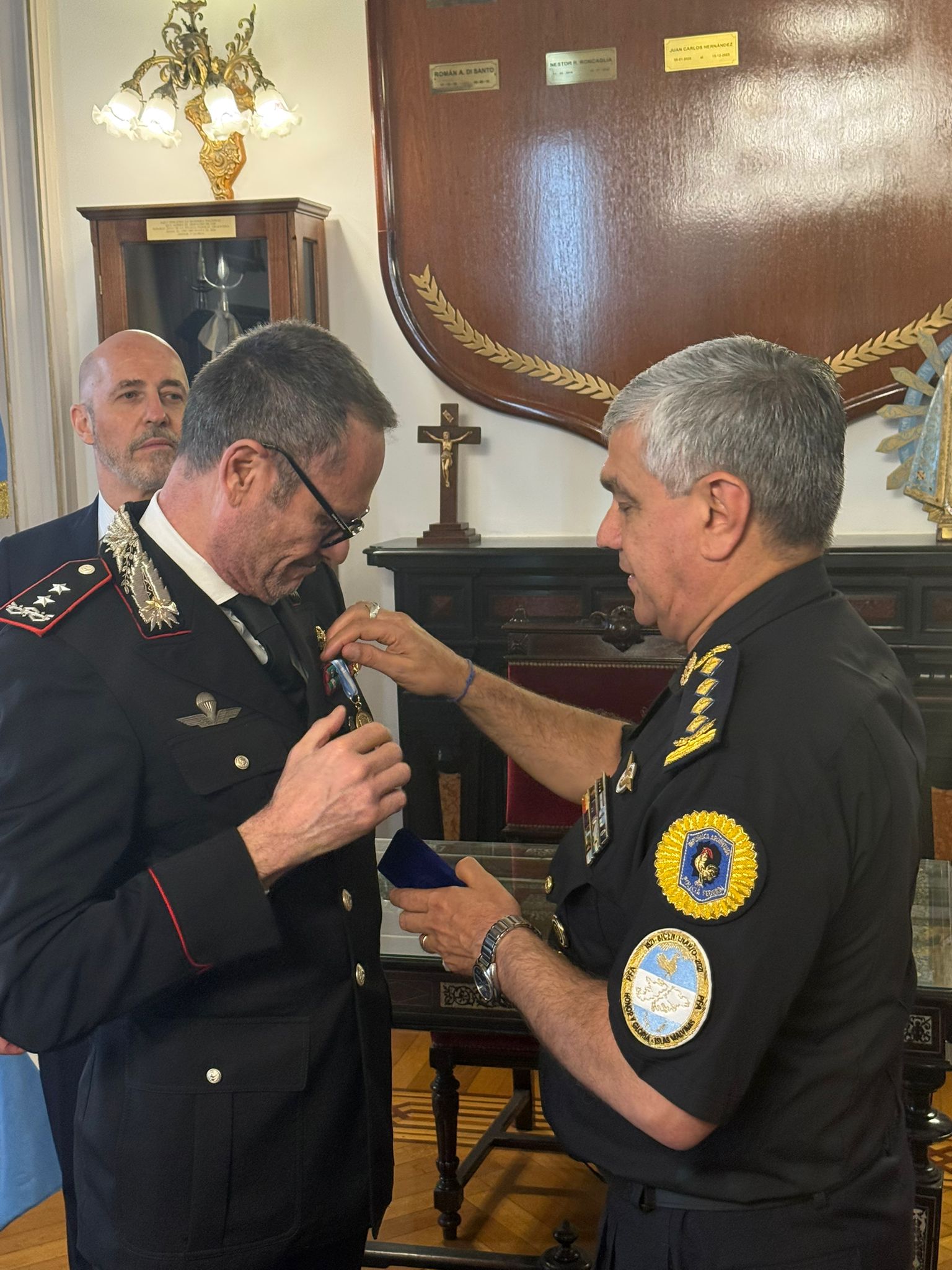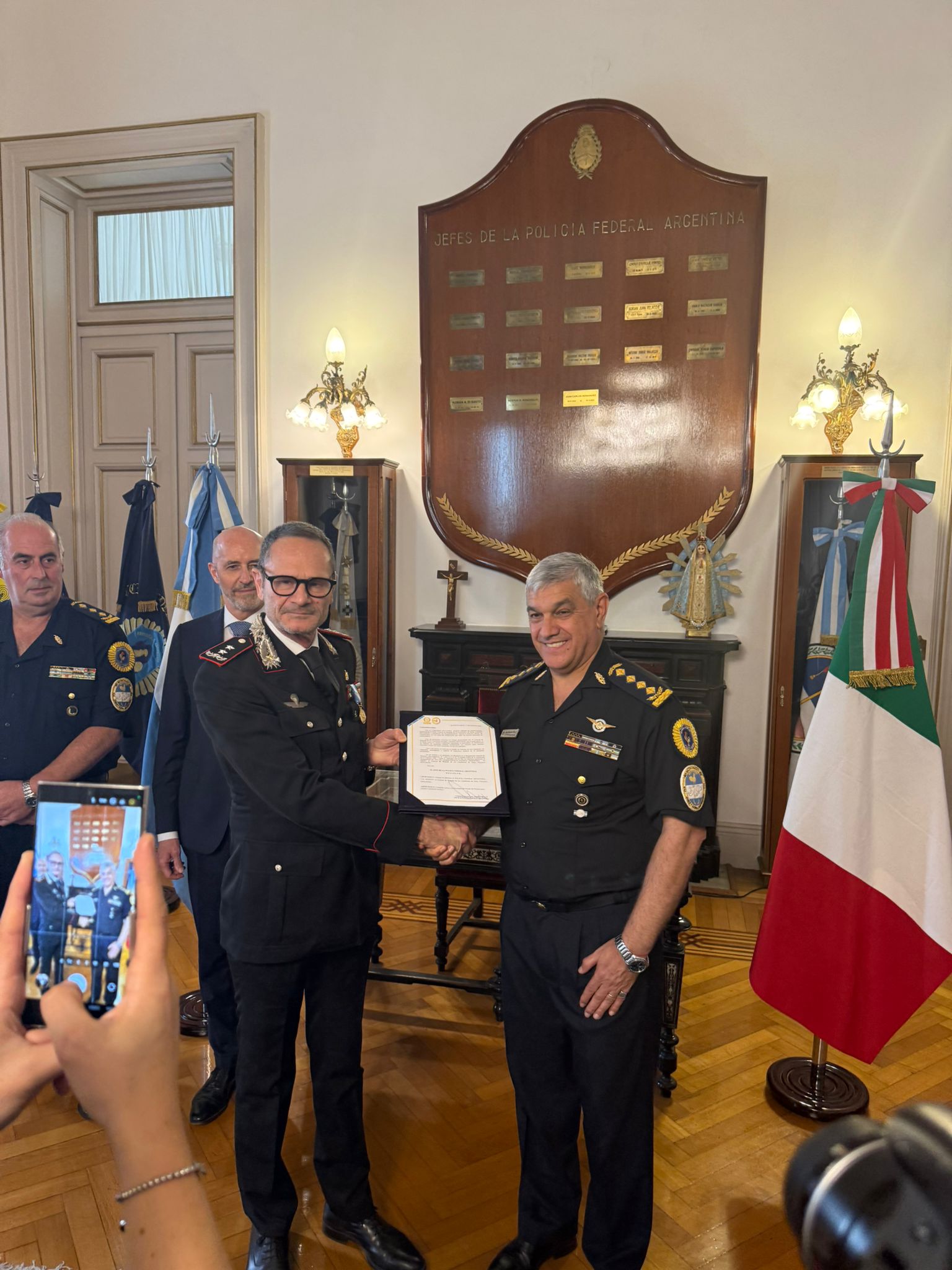 El reconocimiento, otorgado por el Jefe de la Policía Federal Argentina, Comisario General Luis Alejandro Rolle, destaca su gran aporte en la lucha contra el Crimen Organizado, así como su contribución al fortalecimiento de las capacidades técnico-investigativas de las fuerzas policiales, en el marco de la consolidada cooperación entre Italia y Argentina.
