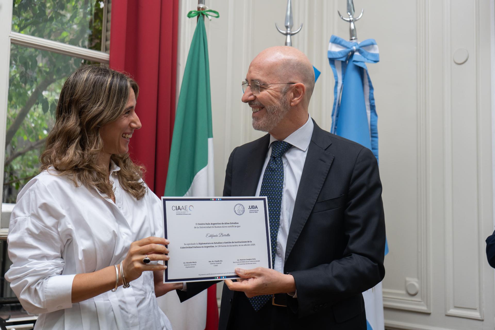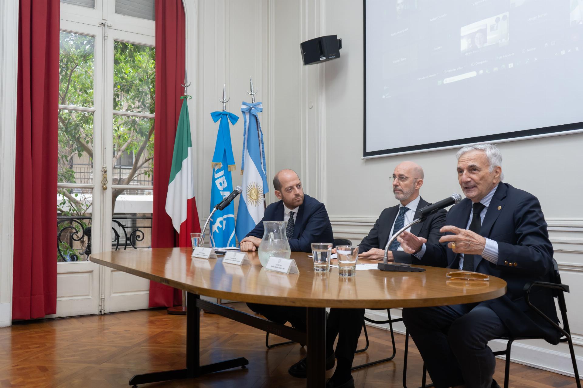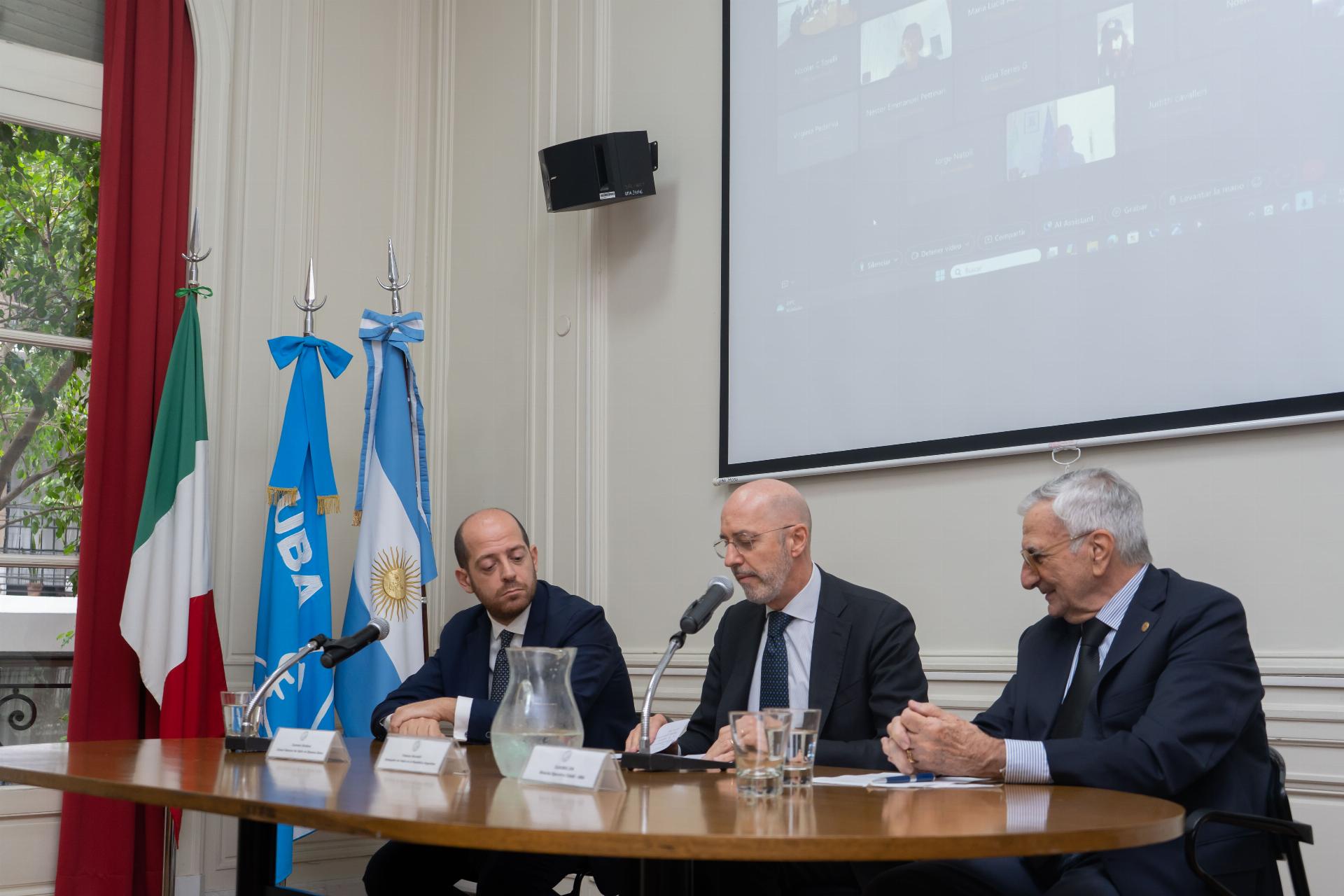 Acompañaron al Embajador en este acto el Cónsul General de Italia en Buenos Aires, Carmelo Barbera; el Cónsul General de Italia en Bahía Blanca, Nicola Bazzani; la Directora de la Secretaría de Relaciones Internacionales de la UBA, Jessica Nessim; y el Director Ejecutivo del CIAAE, Claudio Zin, junto a los Coordinadores y Docentes de la Diplomatura.